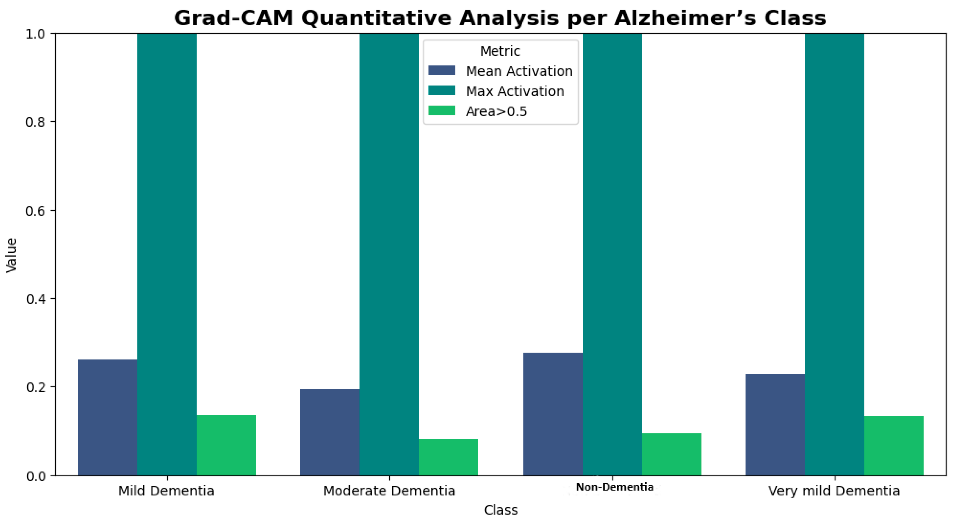 Table 7 shows the mean activation (MA), max activation (MX), and standard deviation (SD) for every class. The mean activation shows the average amount of attention given to the highlighted areas and the degree to which the model was concentrated on recognizing class-specific features. The model continuously focused on the regions of normal brain structures during the scans, as seen by the non-dementia class’s greater mean activation (0.276). The model was concentrated locally on regions of structural degradation brought on by Alzheimer’s disease in the class of moderate dementia, as indicated by the lower mean activation (0.193). Max activation, which was the same for all classes (1.0), indicates the location of the maximum or peak attention or, to put it another way, the area with the highest level of attention in comparison to the other areas in the area. These metrics offer quantitative evidence that the Grad-CAM maps specifically target brain regions that are thought to be class-discriminative (hippocampus and cortical regions in dementia classes vs. normal regions in non-dementia cases). This shows that the model focuses on biologically significant features rather than non-biologically relevant regions. Confidence in the model’s predictions is increased when both quantitative measures and visual maps are provided.