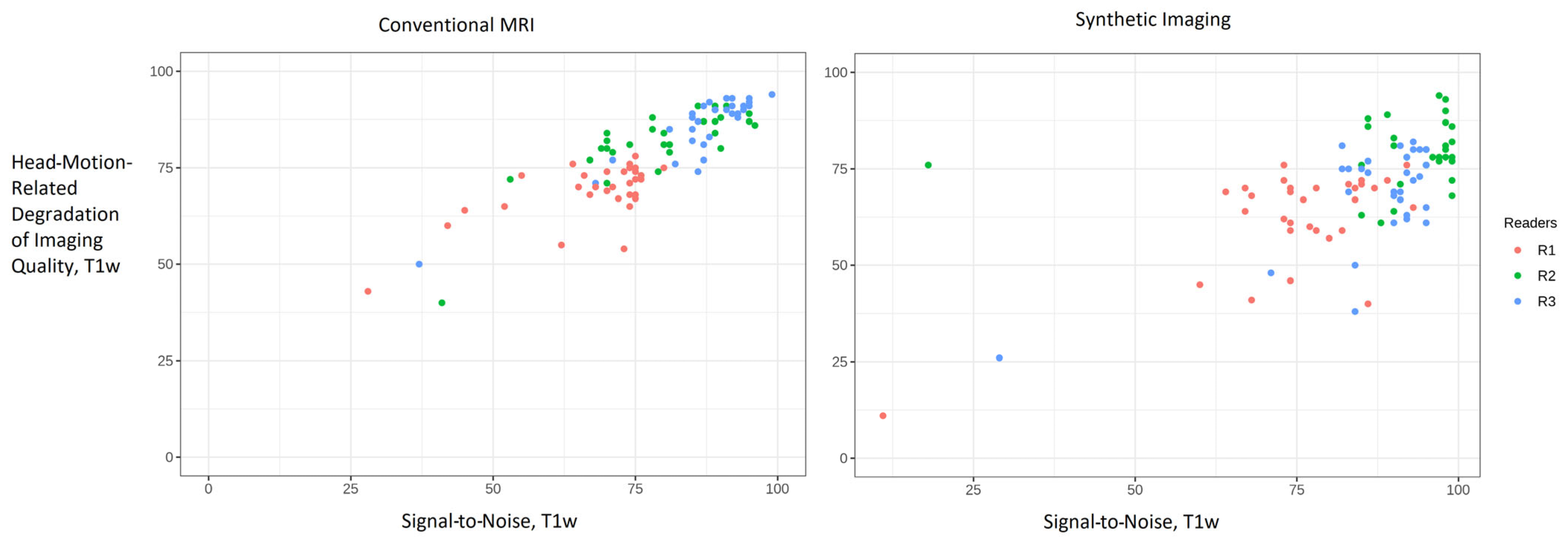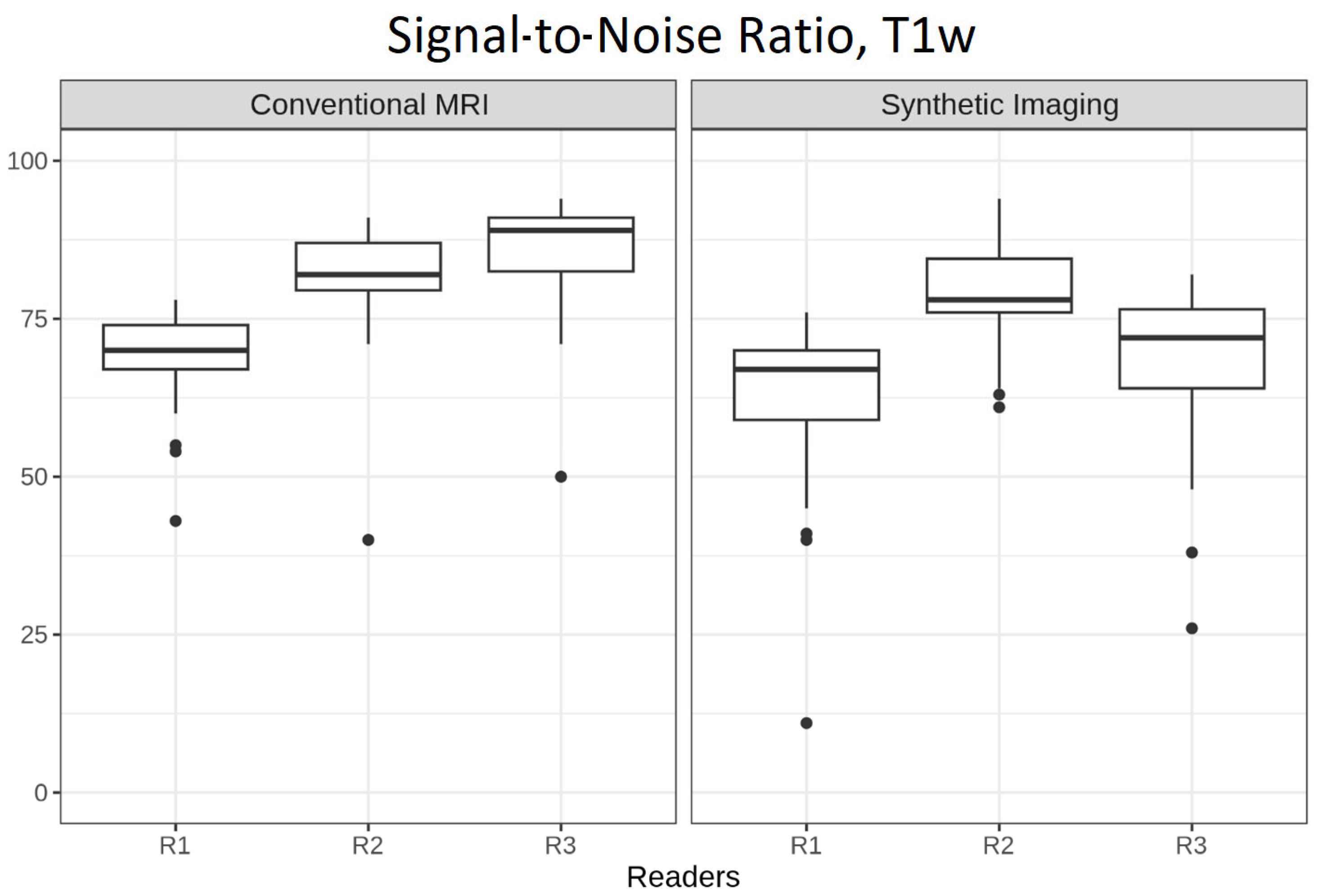 p < 0.001) points lower than their conventional counterparts. Interrater comparison using R1 as the reference demonstrated that R2 and R3 assigned SNR ratings that were 14.63 (11.57 to 17.69,