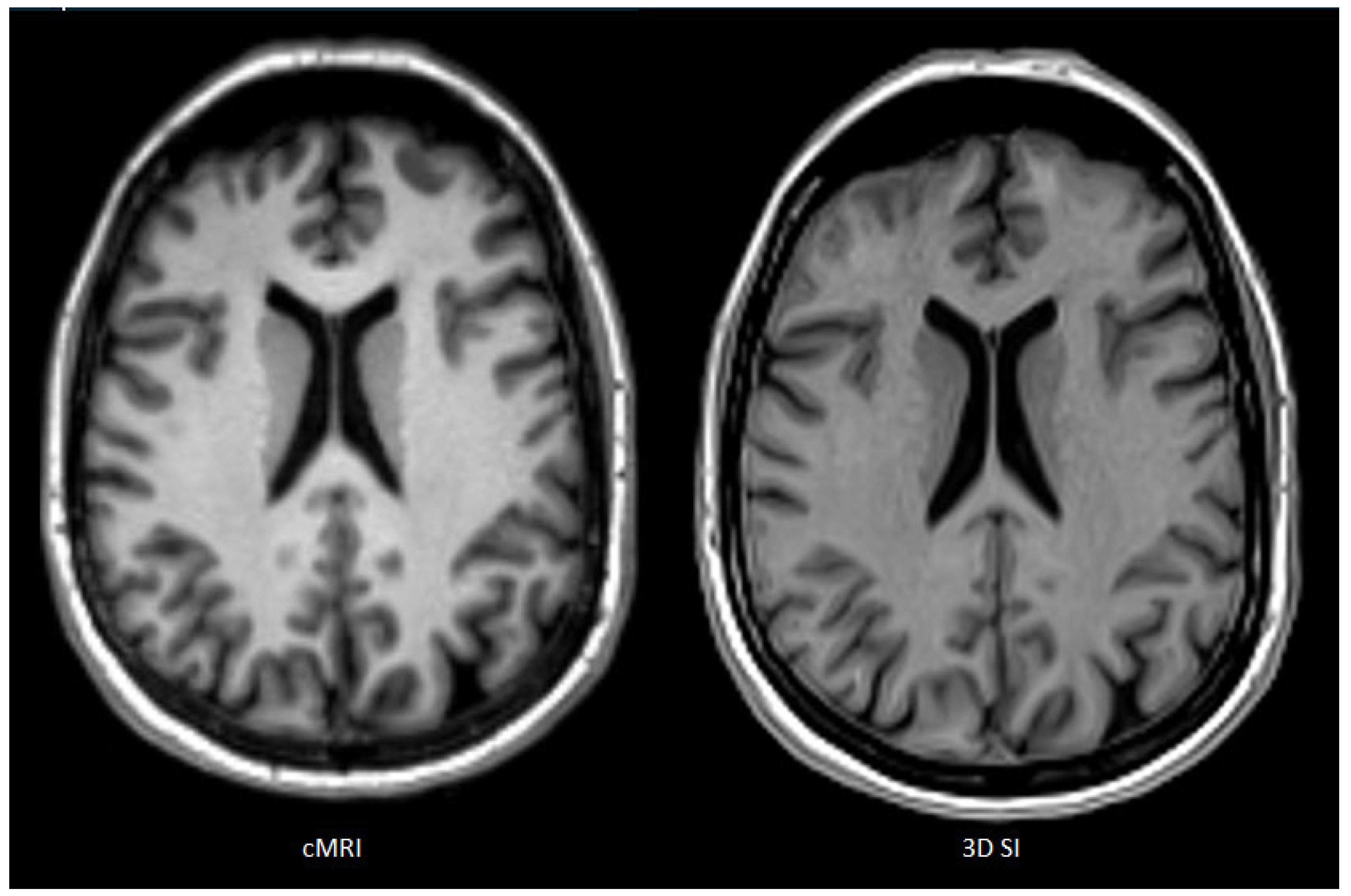 6]. In addition, they evaluated the utility of 3D SI in 24 patients with multiple sclerosis (MS) by comparing diagnostic image quality and lesion volumetry. They concluded that 3D SI could serve as an alternative to conventional MR imaging for the evaluation of MS [