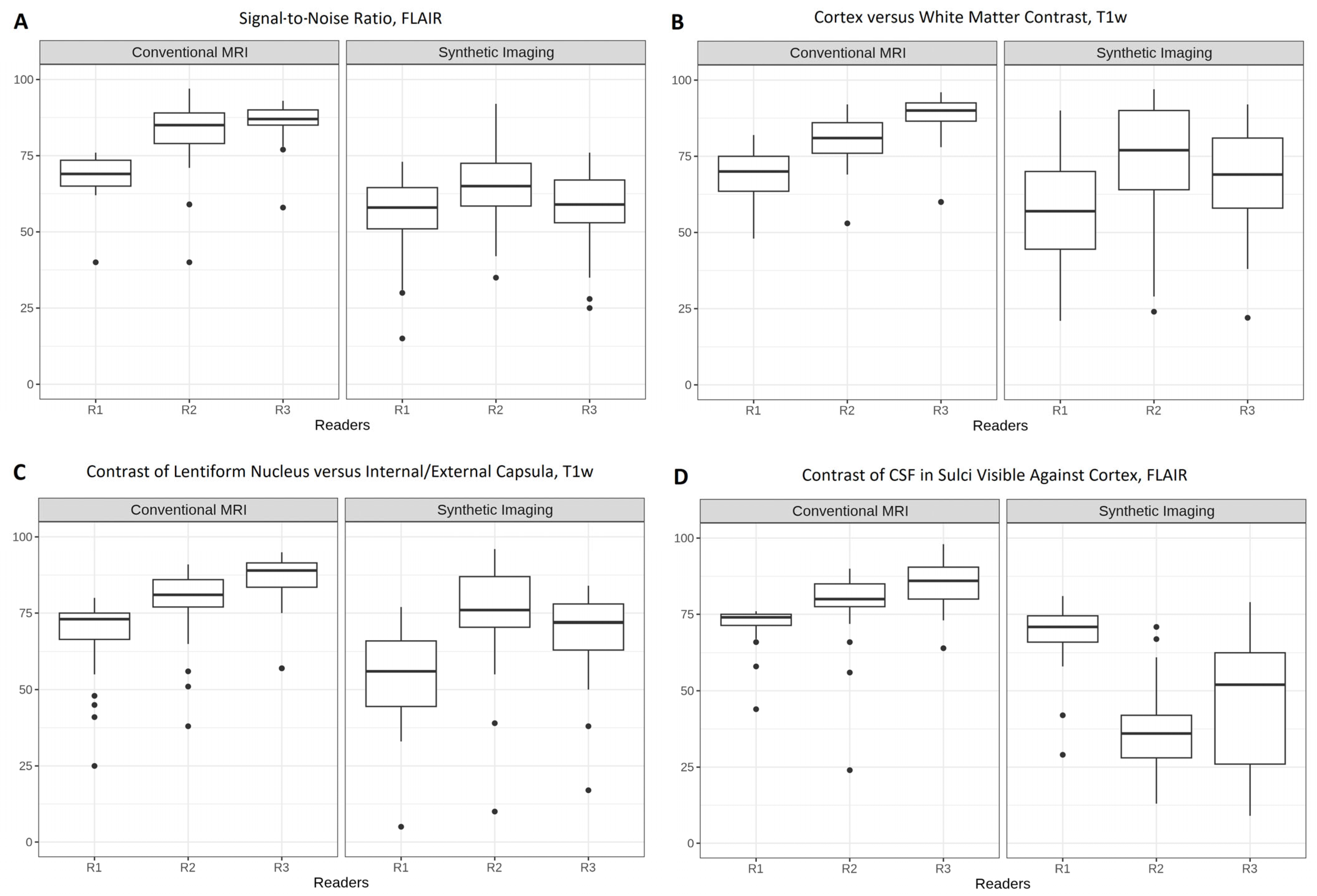 Figure 5 presents boxplots comparing the variable “Contrast of Fluid in Sulci Against Cortex Tissue” for FLAIR images across readers for both cMRI and 3D SI. Signal of CSF in the sulci shows good-to-excellent contrast against cortex of the brain in cMRI (median (IQR): R1, 74 (71.5–75); R2, 80 (77.5–85); R3, 86 (80–90.5). Signal of CSF in the sulci shows only sufficient-to-good contrast against cortex of the brain in 3D SI (median (IQR): R1, 71 (66–74.5); R2, 36 (28–42); R3 52 (26–62.5)).