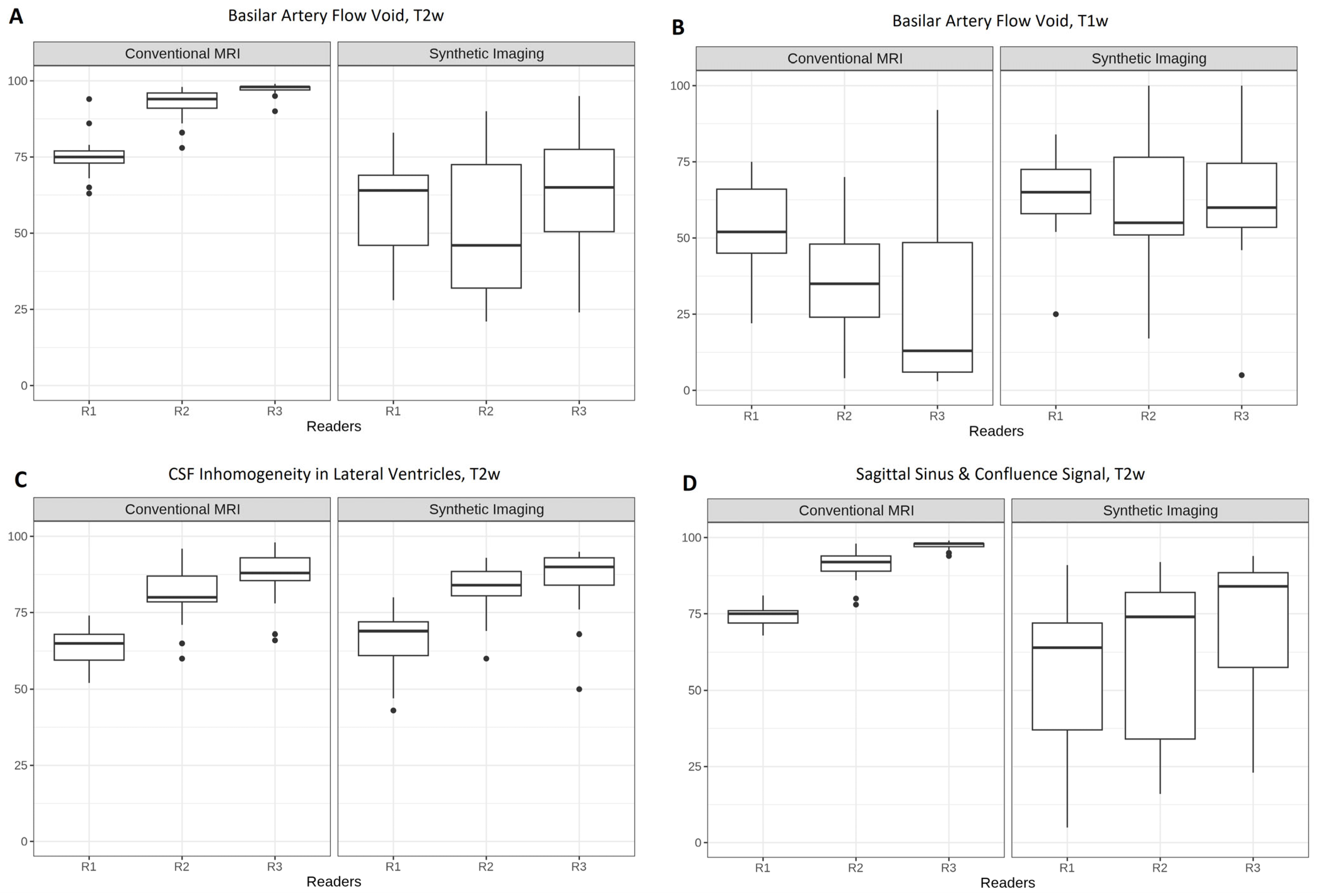 Figure 4 summarizes reader ratings of signal characteristics in anatomically dynamic or fluid-filled regions, particularly focusing on flow-related signal voids and CSF appearance. In cMRI, the hypointense signal of the basilar artery (