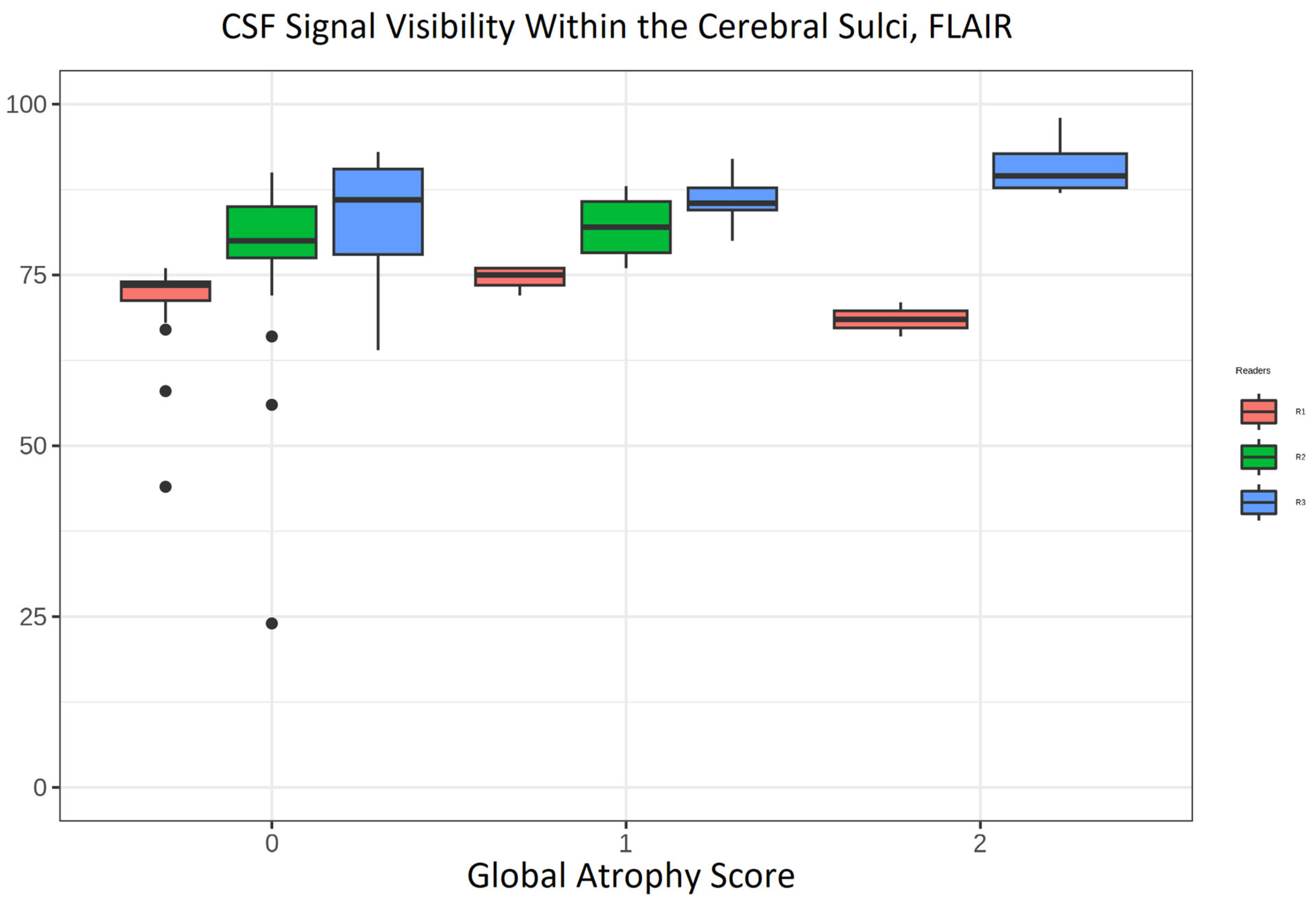 Figure 5 (reader 2: 36 (28–42); reader 3: 52 (26–62.5)—we investigated whether sulcal widening could act as a confounding factor. To demonstrate a possible association between the width of the sulci and the signal of CSF, we used
