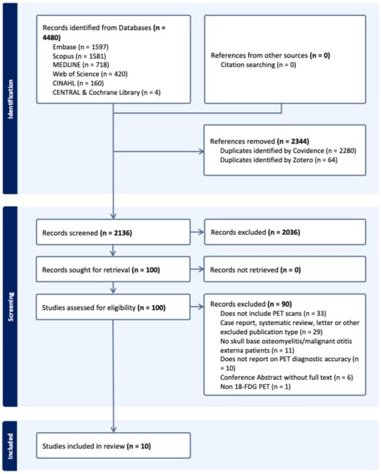 The search identified 4480 records in total from electronic databases, with no additional records from citation searching. After deduplication, 2136 unique records underwent title and abstract screening, of which 2036 were excluded. Full texts were sought for 100 records, of which 90 were excluded. In total, 10 studies were included in the review. The study selection process is depicted in the PRISMA flow diagram (Figure 1), and the full electronic search strategies are provided in Supplementary Data Section S1.