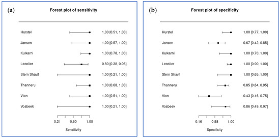 Coupled forest plots for treatment response monitoring (8 studies). (a) Sensitivity estimates with 95% confidence intervals; (b) specificity estimates with 95% confidence intervals.