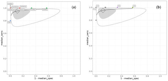 Summary receiver operating characteristic (SROC) curve for treatment response monitoring. (a) SROC with the FDG PET threshold method labelled. (b) SROC with SUVMax threshold labelled for the studies that used it as a diagnostic threshold. Diamond is the summary point (the pooled effect), the grey region is the 95% credible interval, and the dotted line represents the prediction interval. The solid black line is the extrapolated curve between the studies. The vertical axis, median_sens, represents the true positive rate, and the horizontal axis represents the false positive rate.