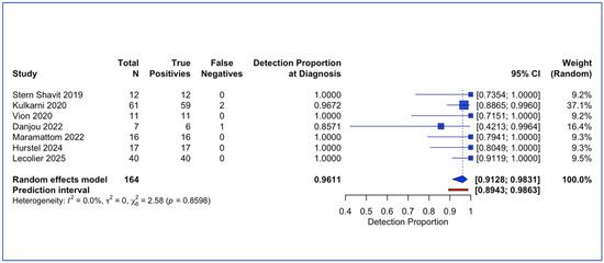 Seven studies comprising 164 lesions (161 with positive PET findings) contributed to the meta-analysis of diagnostic detection proportion at initial presentation. Random-effects meta-analysis yielded a pooled detection rate of 96.1% (95% confidence interval [CI] 91.3% to 98.3%) (Figure 4). Individual study detection proportions ranged from 85.7% [52] to 100.0%. Between-study heterogeneity was minimal, with I2 = 0.0% (95% CI 0.0% to 70.8%), τ2 = 0 (95% CI 0.00 to 1.47), and Cochran’s Q = 2.58 (df = 6, p = 0.86).