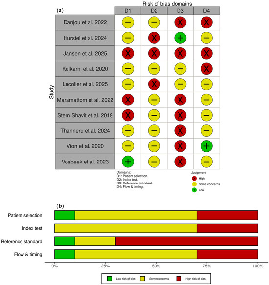 Risk of bias and applicability assessment using QUADAS-2 tool. (a) Traffic light plot showing risk of bias judgements for each included study across four domains [33,44,45,46,47,48,49,50,51,52]; (b) weighted bar chart showing proportions of studies with low, some concerns, and high risk of bias for each domain. Figures generated using the robvis tool [53].