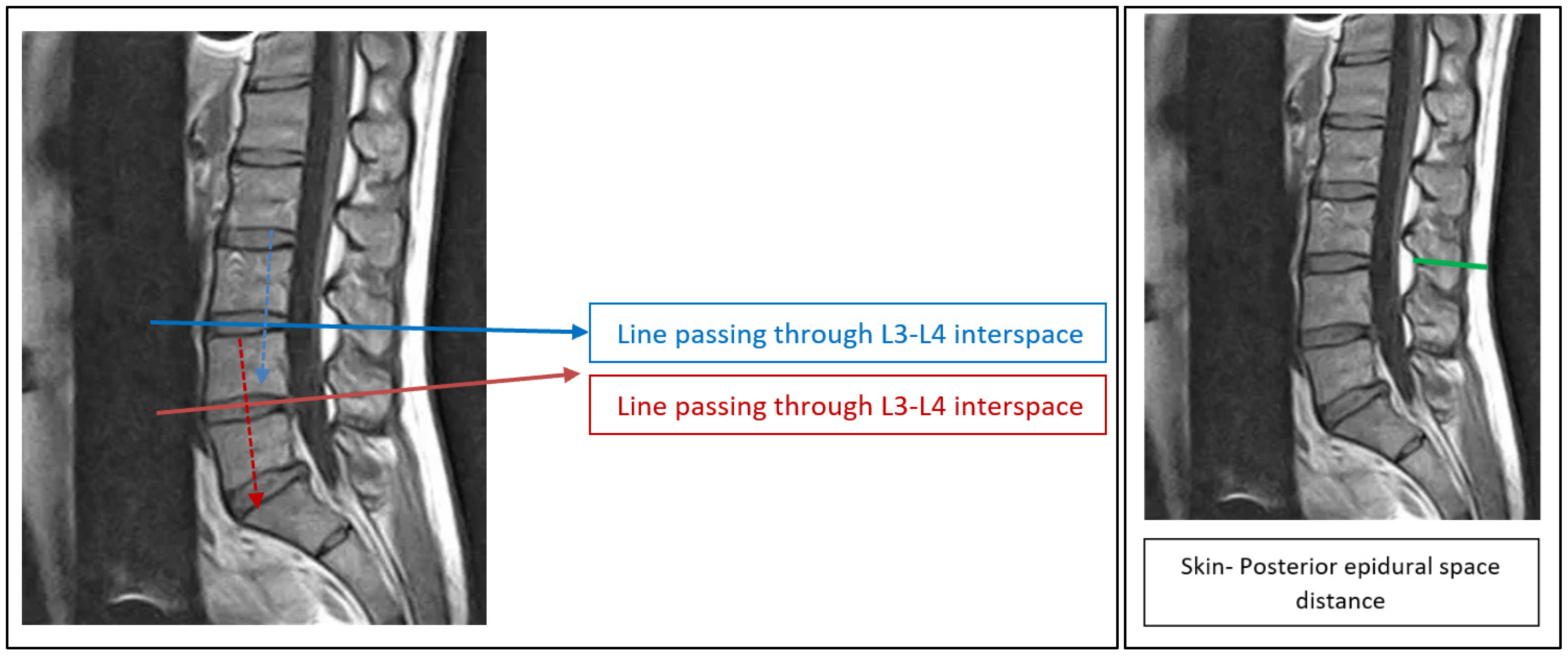 - Wani, T.; Dabaliz, A.; Kadah, K.; Veneziano, G.; Tumin, D.; Tobias, J. Comparison of the skin-to-epidural space distance at the thoracic and lumbar levels in children using magnetic resonance imaging. Saudi J. Anaesth. 2020, 14, 493–497. [Google Scholar] [CrossRef] [PubMed]