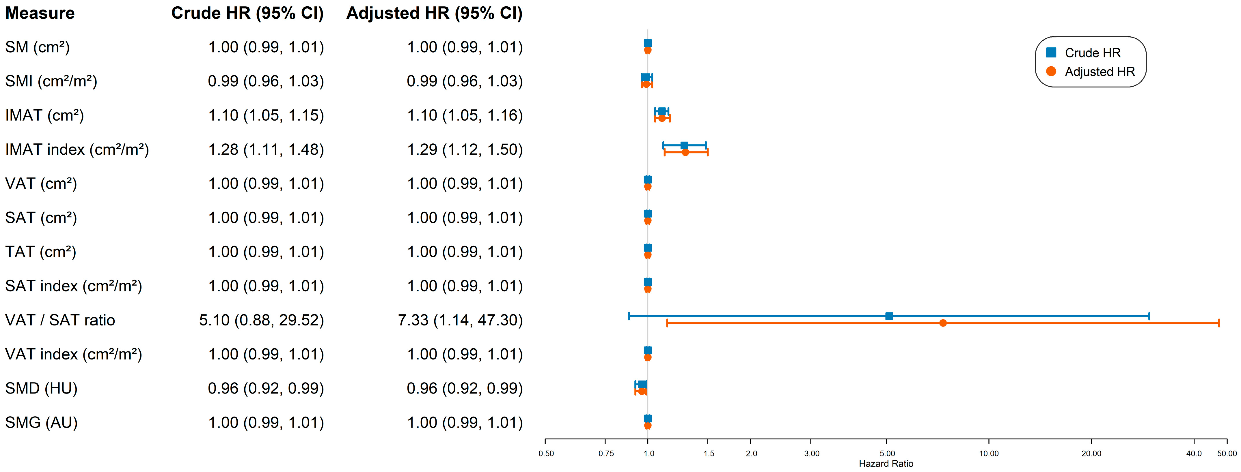 | SM (cm2) | SMI (cm2/m2) | IMAT (cm2) | IMAT Index (cm2/m2) | VAT (cm2) | SAT (cm2) | SAT Index (cm2/m2) | VAT/SAT Ratio | VAT Index (cm2/m2) | TAT (cm2) | |
