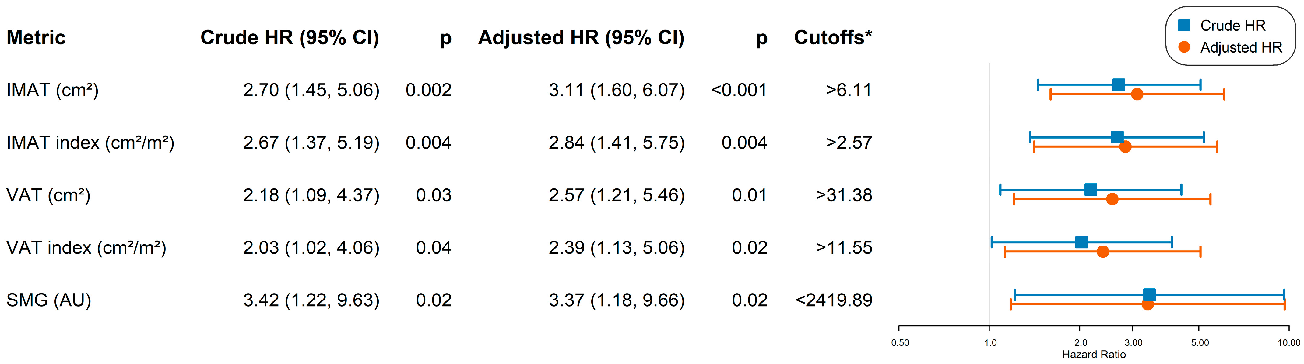 - Sheean, P.; Gomez-Perez, S.; Joyce, C.; O’cOnnor, P.; Bojko, M.; Smith, A.; Vasilopoulos, V.; Rao, R.; Sclamberg, J.; Robinson, P. Myosteatosis at diagnosis is adversely associated with 2-year survival in women with estrogen receptor-negative metastatic breast cancer. Breast Cancer Res. Treat. 2021, 190, 121–132. [Google Scholar] [CrossRef] [PubMed]