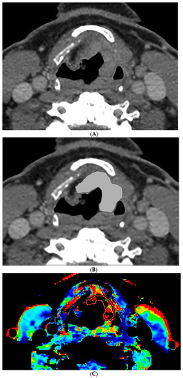 CT and perfusion sections of laryngeal carcinoma on post-treatment images. Axial sections show the grayscale image (A) and outlines for the following: computer (B) and perfusion (C).