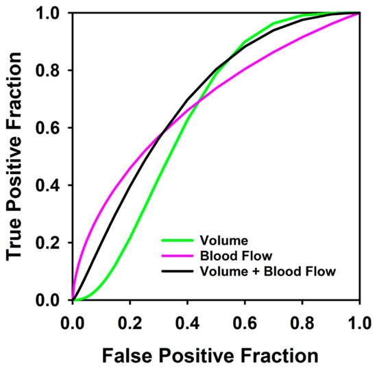 Receiver operating characteristic curves for predicting which patients would not achieve disease free survival at 1 year using blood flow change alone (AUC = 0.66), percent volume change by computer contouring (volume) (AUC = 0.64), and the combined response index for 36 pre- and post-induction therapy tumors (AUC = 0.69).