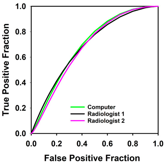 Receiver operating characteristic curves for predicting which patients would not achieve disease free survival at 1 year using combined response index of blood flow and percent volume change calculated from contours by computer, Radiologist 1, and Radiologist 2 in 36 pre- and post-induction therapy tumors. AUC for the computer, Radiologist 1 and Radiologist 2 were 0.69, 0.71 and 0.68 respectively.