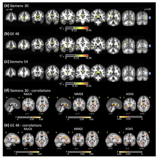 Significant clusters (η2-p > 0.15 and size > 100 voxels) obtained with ANCOVA for fractional anisotropy (FA) from FSL (linear least square (LLS) algorithm) for (a) SI30, (b) GE48, and (c) SI54. Significant Spearman’s correlations (|r| > 0.50 and size > 100 voxels) from FSL (LLS algorithm) between the cognitive tests and FA maps from (d) SI30 and (e) GE48. No significant correlations were found for SI54.