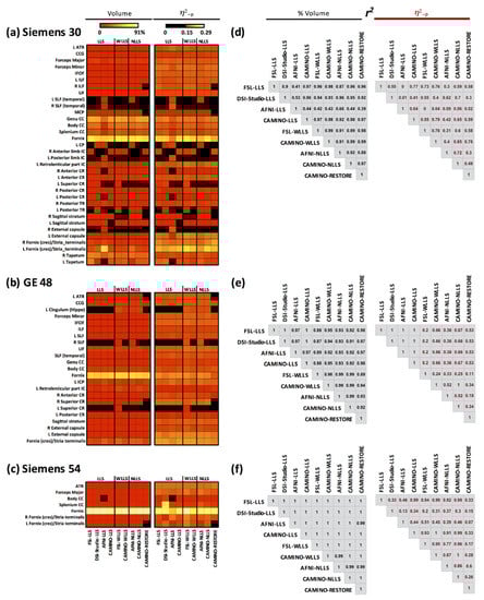 The correlation matrix (Panels d–f, Figure 2) for the cluster volume displays r2 values greater than ≥0.87 for GE48 (panel e), indicating good volumetric agreement across all fitting algorithms. On the other hand, for η2-p, all WLLS (FSL–WLLS and CAMINO–WLLS) and NLLS (AFNI–NLLS, CAMINO–NLLS, and CAMINO–RESTORE) exhibit small r2 values, suggesting poor agreement for effect size compared with the other fitting methods. Lower correlation values are observed for SI30, particularly for AFNI–LLS (r2 ≤ 0.66 and r2 ≤ 0.09 for the cluster volumes and η2-p index, respectively), indicative of poor agreement compared with the other fitting methods. With more directions, fit consistency is much higher for SI54 (r2 ≥ 0.99 for cluster volume), indicating excellent agreement across all fitting algorithms. However, less consistency is observed for η2-p index, indicating that volume differences are consistent across fits, but the effect sizes are less reliable. In other words, volumetric differences are less sensitive to the fit type when more directions are used, but the magnitude of the difference (i.e., effect size) remains sensitive to the type of fit.