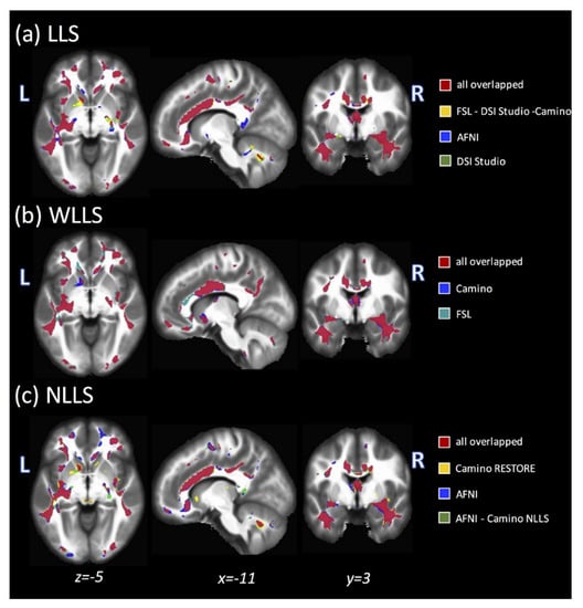 - Wakana, S.; Caprihan, A.; Panzenboeck, M.M.; Fallon, J.H.; Perry, M.; Gollub, R.L.; Mori, S. Reproducibility of quantitative tractography methods applied to cerebral white matter. Neuroimage 2007, 36, 630–644. [Google Scholar] [CrossRef]