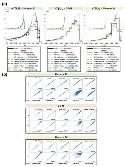 Figure 4 panel (a) shows the ICC results across acquisitions and fits. The r-ICC shows excellent similarity between fits for all acquisitions (r-ICC > 0.90) []. However, compared with GE48 and SI54, the SI30 acquisition showed a lower r-ICC across all fits (mean r-ICCSI30 = 0.94 versus r-ICCGE48 = 0.99 and r-ICCSI54 = 0.99). The r-ICC was slightly increased when CAMINO–RESTORE (∆r-ICCGE48 = +0.0016, ∆r-ICCSI30 = +0.0014, ∆r-ICCSI54 = +0.0011) and AFNI–LLS (∆r-ICCGE48 = +0.0020, ∆r-ICCSI30 = +0.0248, ∆r-ICCSI54 = +0.0036) were removed from analysis. This indicates that most of the algorithms produce highly similar results, while CAMINO–RESTORE and AFNI–LLS are less similar compared with the other fitting algorithms.