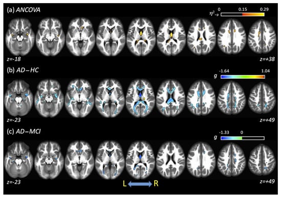 Results obtained using an average of all diffusion tensor imaging (DTI) acquisitions and fits. (a) ANCOVA analysis shows differences across all groups. (b,c) show the differences between AD and HC and between AD and mild cognitive impairment (MCI), respectively. No differences were found for the HC–MCI comparison.
