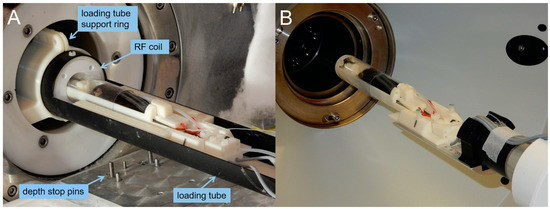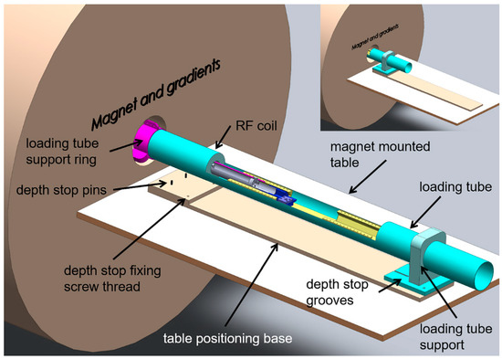 Our group operates MRI scanners that use magnets produced by Varian with electronic controls provided by both Varian (7.0 T) and Bruker (4.7 T). Each magnet features a built-in table at the front of and below the magnet bore. For these systems, we typically, though not exclusively, operate a coil-in-cradle loading apparatus, which positions the isocentre of the radiofrequency (RF) coil at the isocentre of both the magnet and the gradient set, as shown in Figure 1. This loading tube assembly consists of a combination of permanently installed and removable components.