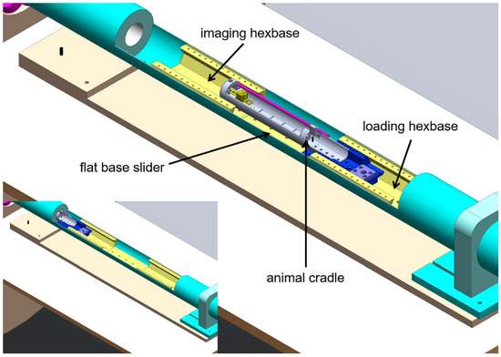 Within the loading tube, there are two hexagonally shaped dovetail (hexbase) adaptors (one is used during scanning, and the other during animal and cradle loading and unloading) and a flat-base insert in between the two that provides a constant plinth height for sliding the animal cradle between hexbase adaptors, as shown in Figure 2. The animal cradle base has a hexagonal profile that fits the hexbase adaptor and a vertically oriented screw is used to lift the animal cradle within the hexbase adaptor and lock the two together.