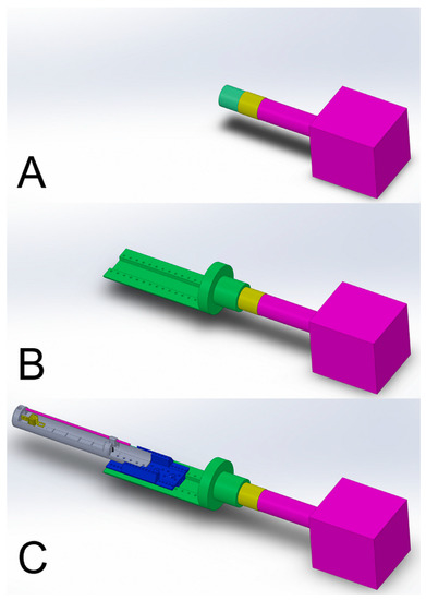 Schematic views of the cradle coupling unit on the positron emission tomography/single-photon emission computed tomography/computed tomography (PET/SPECT/CT) scanner. (A) The purple block represents the gantry that performs the 3-axis sample translations that are used to create the spatially resolved projections. (B) The manually operated cradle–gantry locking ring (yellow) is rotated to stretch an expansion ring over which the plinth adaptor (green) is mounted. (C) The animal cradle is positioned within the rectangular groove of the plinth adaptor and fixed in position using vertically oriented screws that attach to the plinth adaptor.