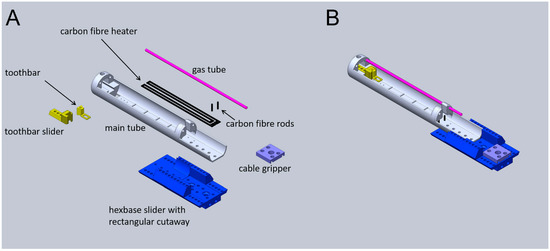 Schematic of the animal cradle as individual components (A) and assembled unit (B). The main tube (grey), where the animal lies, is permanently attached to the hexbase slider (blue). The toothbar features both horizontally and vertically adjustable positioning (yellow). The cable gripper (purple) is available for tethering any additional services that may be required, and multiple grippers can be stacked if multiple cables or tubes are required. The gas delivery tube (pink) is permanently mounted. The ridges on the flat base of the main tube are for attachment of the electrocardiogram (ECG) plate. The respiration monitor clips into the aperture at the hexbase slider end of the main tube, the latter also acting as the access point for the rigid rectal thermometer. The sheath tube (not shown) is a snug fit over the support rings that are located at the front and towards the back of the main tube. The carbon fibre heater, mounted underneath the main tube, is coupled to the power feed wire through the carbon fibre rods.