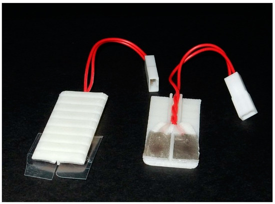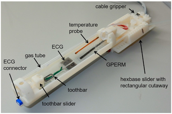 Respiration was monitored using a graphene-based piezo-electric monitor (GPERM) formed from a strip of 110-m-thick, poled uniaxial polyvinylidene fluoride (PVDF) polymer (Precision Acoustics, Dorset, UK) that was cut into 6 × 90 mm2 long strips and onto which 3 × 85 mm2 stripes of particulate graphene (Elicarb, Thomas Swan, Durham, UK) were painted on each side. The area of painting was restricted using masking sheets prepared from envelope-label stickers into which 3 × 85 mm2 apertures were formed using a laser cutter (Speedy100, Trotech, Boldon, UK), and the painted strip was encased in thin, 75 g/m2, laminator sheet plastic, which had a 2-mm-diameter hole punched through for exteriorisation of the conductive graphene. CT-compatible electrocardiogram (ECG) pads (Neotech micro, Inspiration Healthcare) that feature carbon fibre wires were positioned over the punched holes to couple the graphene strip to the signal carrier wires that were cut to ca. 50 mm lengths, and the strip and cable were mounted into a 3D-printed cartridge that was terminated with an RCY connector (Socket part number 688-1448, plug part number 688-1445, female pins part number 688-1436 and male pins part number 161-3367 from Japanese Solderless Terminals) for coupling to its flying lead and non-magnetic 15-pin D-sub connector. A cartoon and a photograph of the assembly is shown in Figure 6.