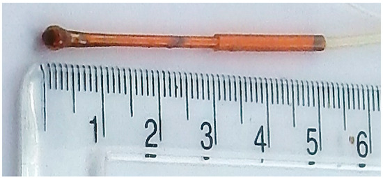 A fibre-optic thermometry system (Accusens, Opsens, Canada) was used for monitoring the animals’ temperature, which was maintained using an imaging-compatible heating system described previously [9]. The blunt end of the thermometer probe was rounded, as depicted in Figure 8, using a crafted ball of epoxy glue so as to protect the animal from scratch-related injury.