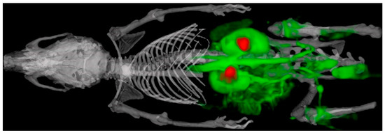 Multi-modal SPECT/CT/DCE-MRI of the mouse using the system-agnostic, adaptable and extensible animal support cradle system. The skeleton, kidneys and major vessels to the kidneys are marked up in the MIP. The skeleton (white) was imaged by CT, while 99mTc-diethylene-triamine-pentaacetate (99mTc-DTPA) (red) and gadodiamide (green) were used for SPECT and DCE-MRI of the kidneys, respectively.