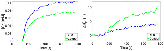 A comparison of time-dependent CA concentration curves (left) and transverse relaxation rate changes (right) obtained in the tibialis anterior muscle compartment of an ALS patient and a healthy control.