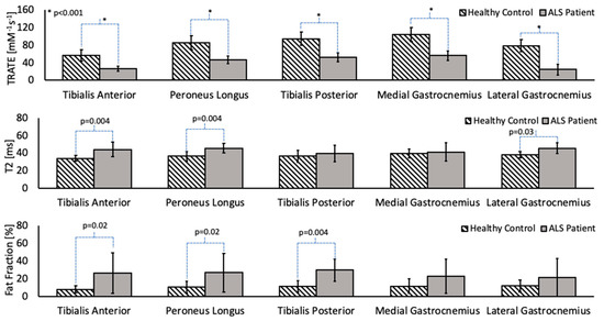 Across patients, the differences in TRATE, fat fraction and T2 values between affected and healthy muscle are highlighted in Figure 3 for the tibialis anterior, tibialis posterior, peroneus longus, lateral head of the gastrocnemius and medial head of the gastrocnemius muscles. On average, the T2 and fat fraction values in ALS-affected muscle were found to be higher than in healthy muscle; however, there were muscle groups in multiple patients that did not exhibit a perceptibly higher fat fraction or T2, such as the example shown in Figure 2. A significant decrease in TRATE was observed across all muscle groups (p < 0.0001) in the ALS patients when compared with healthy control muscle groups. The fat fraction differences between ALS-affected and healthy muscle in the medial and lateral gastrocnemius muscle were not significantly different (p = 0.07 and p = 0.06, respectively) but were observed to be significantly different in the tibialis anterior (p = 0.01), tibialis posterior (p = 0.004), and peroneus longus (p = 0.02) muscle groups. The T2 differences between ALS-affected and healthy muscle in the tibialis posterior and medial gastrocnemius muscle were not statistically significant (p = 0.06 and p = 0.07, respectively) but were observed to be significant in the tibialis anterior (p = 0.004), peroneus longus (p = 0.004) and lateral gastrocnemius muscle groups (p = 0.03).