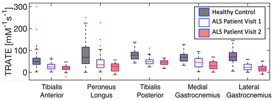 Evolution of TRATE measurements over time in a representative dataset are presented as boxplots for each muscle group. TRATE reduction between visits 1 & 2 was observed among all ALS affected muscle groups.