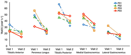 The evolution of TRATE measurements in a representative ALS dataset over two timepoints and TRATE measurements in a representative healthy control dataset at a single timepoint are presented as boxplots for each muscle group in Figure 4. Across all muscle groups, TRATE decreased between the two imaging time points. Furthermore, TRATE values between visits were both lower than those found in healthy controls across all muscle groups. Figure 5 highlights the longitudinal evolution of average TRATE measures for each muscle group. Table 3 compares TRATE (averaged over all muscles) measures with ALSFRS-R and HHD scores. ALSFRS-R total scores decreased on average at the rate of 0.8%/month, and ALSFRS-R LL scores decreased on average at a rate close to 2%/month. HHD scores decreased on average at the rate of a little over 2%/month. Average TRATE decreased at a rate close to 4%/month. TRATE measures for each muscle ROI decreased on average as follows: tibialis anterior at the rate of 4%/month, peroneus longus at the rate of 8%/month, tibialis posterior at the rate of 3%/month, medial gastrocnemius at the rate of 5%/month and lateral gastrocnemius at the rate of 5%/month. While ALSFRS-R and HHD scores were expected to decrease between the two visits, confounding results were observed while recording both clinical measures. Two patients did not exhibit any difference in ALSFRS-R scores (total and lower limb) between the two visits (ALSFRS-Rtotal = 42, ALSFRS-RLL = 7 and ALSFRS-Rtotal = 39, ALSFRS-RLL = 6), while TRATE was found to decrease in each patient between the two visits. When averaged over all patients, TRATE decreased by 28 ± 16% in the tibialis anterior, 47 ± 18% in the peroneus longus, 25 ± 19% in the tibialis posterior, 29 ± 14% in the medial gastrocnemius and 35 ± 18% in the lateral gastrocnemius muscles between visits. Individual ALSFRS-R scores for the longitudinal data are presented in Supplementary Digital Content SDC1. Two patients scored paradoxically higher on the muscle strength test during visit 2 (HHDtotal, left = 140 lbs, HHDtotal, right = 139.3 lbs and HHDtotal, left = 98.2 lbs) compared with visit 1 (HHDtotal, left = 129.8 lbs, HHDtotal, right = 135.9 lbs and HHDtotal, left = 78.4 lbs), although for one patient, this was attributed to recorded symptom onset and progression in the lower right extremity. The individual HHD scores for both visits are outlined in Supplementary Digital Content SDC2.