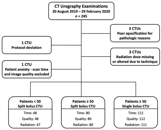 A flowchart of the study cohort is provided as Figure 1. There were 245 CTUs performed during the study period. Three CTUs were excluded due to the pathologic processes causing poor opacification of the urinary collecting system (two bladder tumors and one colovesicular fistula). One CTU was excluded due to protocol deviation. Three CTUs were excluded from radiation dose analysis (one dose report missing, and two imaging scan length protocol deviations). One CTU was excluded from the scan time and imaging quality assessment as the patient became anxious during examination, and the CT was temporarily halted.
