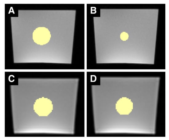 Sample set of MRI ROIs. (A–D) are examples of MR images of the phantom with differently sized ROIs (in yellow). (A,B) are images acquired with the T1w sequence, (C,D) are images acquired with the T2w TIRM sequence. The left column shows ROIs with a 16 mm diameter, the right column ROIs with a 16-pixel diameter. Due to the different spatial resolutions, the 16-pixel ROI in the T2w TIRM image has a greater diameter than the 16-pixel ROI in the T1w image. Both T1w and T2w TIRM-weighted images show typical, gradient-like inhomogeneities within the phantom (brighter at the bottom, darker at the top).