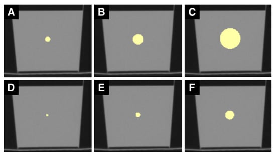 Sample set of CT ROIs. (A–F) are CT images of the phantom. (A) shows a ROI with a 4 mm diameter, (B) with 8 mm, and (C) with 16 mm. (D) illustrates one slice of the 4-pixel diameter ROI, (E) of the 8-pixel, and (F) of the 16-pixel diameter ROI. mm sized ROIs are generally larger than px sized ROIs.
