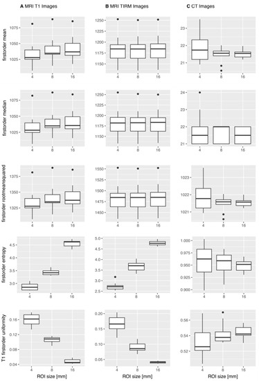Compared to the MR images, only a few first-order features were significantly different between ROI sizes: range, energy, and total energy showed significant differences in all possible ROI combinations; 10th percentile, variance, MAD, and minimum showed difference in at least one compound. The features mean, median, RMS, entropy, uniformity, skewness, 90th percentile, RMAD, and IQR did not show differences in any pair.