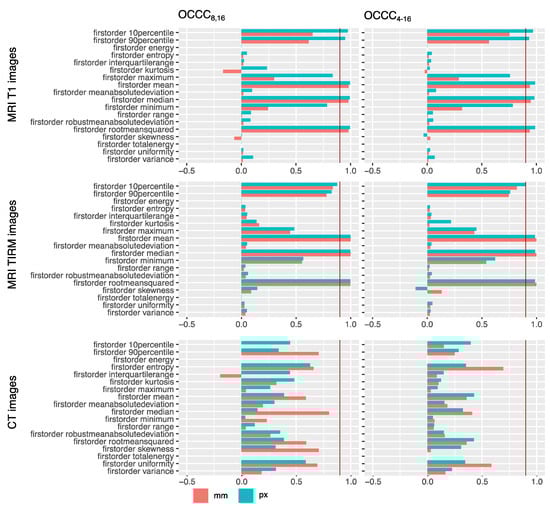 OCCCs8,16 and OCCCs4–16 for ROIs drawn in millimeters (red) and pixels (green). Excellent agreement of 0.9 is marked with a red line. Second- and higher-order features as well as numerical values can be found in the Supplementary Materials (Figures S1–S3, Tables S1–S3). Mean, median, and root mean squared concordantly showed excellent agreement across ROI sizes for MR images. None of the features showed excellent agreement for CT images; here, the best agreement of 0.8 is shown by the feature median for the millimeter sized ROI OCCCs8,16.