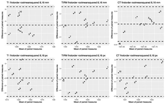 Bland–Altman plots for the first-order feature root mean squared for pixel-sized and mm-sized ROIs from CT and MR images. Bland–Altman plots for T1w MR images on the left, for T2w TIRM images in the middle, and for CT-derived images on the right side. The upper row shows root mean squared extracted from mm sized ROIs, the lower row root mean squared extracted from px sized ROIs. Bland–Altman plots for all features are shown in the Supplementary Materials (see Figure S5).