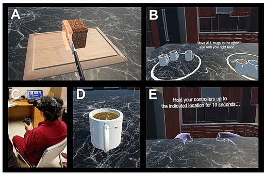 Screen outputs for virtual reality (VR) Time (A) and VR activities of daily living (ADL) Score (B) tests. Patient undergoing VR Time trial in a seated position (C). Close-up view of a mug containing liquid being designed for the VR ADL Score test (D). Screen output for the VR Posture Tremor test (E).