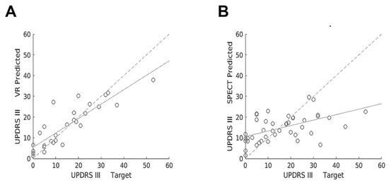Scatter plots showing target versus predicted UPDRS-III scores with VR (A) and [123I]FP-CIT SPECT (B) obtained using a regression SVM machine learning model for the entire data set. Linear regression lines show correlation between target versus predicted UPDRS-III scores (continuous lines) and target versus target scores (dashed lines).