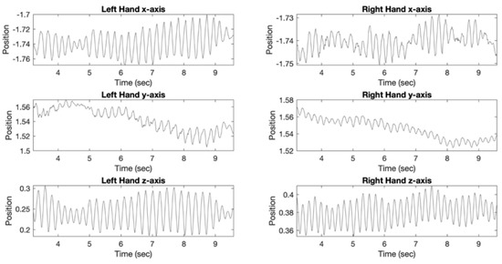Plots demonstrating position (x, y, and z axis) versus time for Posture VR tremor assessment in a 67-year-old right-handed female. Analysis of left upper extremity VR data demonstrated VR Posture Tremor Power of 7.26 × 10−4 m2/Hz and VR Posture Tremor Frequency of 4.7 Hz. Analysis of right upper extremity VR data demonstrated VR Posture Tremor Power of 1.26 × 10−4 m2/Hz and VR Posture Tremor Frequency of 5.4 Hz. MoCA score was 21 and UPDRS-III motor score was 21 with tremor sub-scores (UPDRS 3.15, 3.17, 3.18) ranging from 1 (slight) to 2 (moderate). Patient was not receiving medication for PD.
