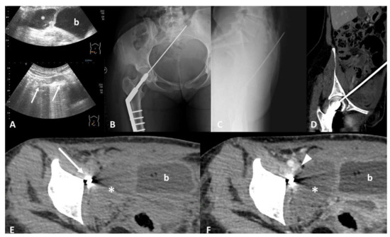 Device identification and recognition. Twenty-nine-year-old female with acute abdominal pain after surgical repair of a traumatic femoral neck fracture. Ultrasound scans (A) show a hypoechoic collection (*) in the right iliac fossa, close to the bladder (b), and a linear hyperechoic image with sonographic artifacts (arrows). Frontal (B) and lateral (C) radiographs show a sharp portion of the osteosynthesis passing through the pelvis, with the tip into the soft tissue of the anterior abdominal wall. Computed Tomography (CT) multiplanar reconstruction images better show the course of the misplaced device from the femoral head to the anterior abdominal wall (D). Non-enhanced CT scan (E) confirms a large collection (*) in the right iliac fossa, next to the misplaced device (arrow), characterized by hematic density. Contrast-enhanced CT images (F) better define the relationship between the collection (*) and the iliac vessels, showing a hypodense filling defect (arrowhead) inside the right external iliac vein (EIV), suggesting the diagnosis of a hematic collection due to iatrogenic injury of the EIV caused by the misplaced device.