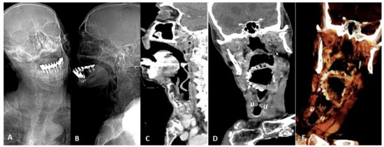 Device migration. Eighty-seven-year-old man affected by Alzheimer disease and asphyxiation crisis. Frontal (A) and lateral (B) head and neck CT scout views show denture migration with hypopharynx impaction. Contrast-enhanced CT sagittal (C) and coronal (D) scans better show denture relationship with the surrounding structures and demonstrate anterior epiglottis displacement with subsequent airways restriction (arrow). 3D VR image thin slab (5 mm) view (E) better shows device migration.