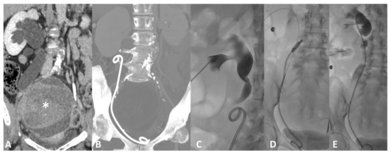 - Contegiacomo, A.; Amodeo, E.M.; Cina, A.; Distasi, C.; Iezzi, R.; Coppolino, D.; Attempati, N.; Manfredi, R. Renal artery embolization for iatrogenic renal vascular injuries management: 5 years’ experience. Br. J. Radiol. 2020, 93, 20190256. [Google Scholar] [CrossRef] [PubMed]