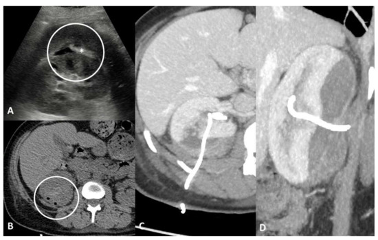 Parenchymal/tissue injury. Forty-one-year-old female with persistent haematuria after percutaneous nephrostomy placement. Axial ultrasound scan (A) shows hypoechoic collection of the right kidney with hyperechoic material inside (*). Non-enhanced CT scans (B) confirm the presence of a subcapsular hematic collection associated with a heterogeneous density area in the posterior renal parenchyma. Axial (C) and coronal (D) maximum intensity projection CT images show more clearly the large parenchymal laceration and the direct relationship with the nephrostomy tube, without signs of active bleeding.