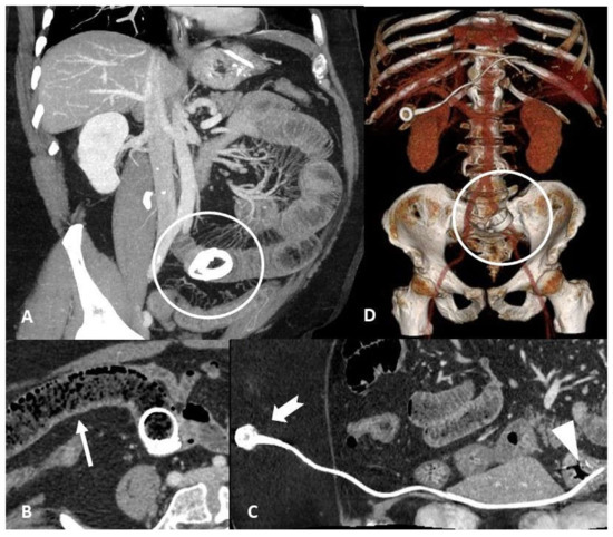 Visceral obstruction occurs when a device induces the occlusion of the visceral lumen. The mechanism can be twofold: intraluminal or extraluminal. Intraluminal occlusion occurs when an intraluminal device or its fragment migrates from the operative site to a distal location where the visceral lumen is small enough to halt its progression (Figure 8), or if the content of the viscera is too viscous to get past the device regularly [10]. Extraluminal occlusion is usually the consequence of an extrinsic compression of the viscera by devices implanted either for the injured organ or for an adjacent one. The obstruction mechanism is defined as mechanical if the device compression directly induces the luminal occlusion; if the occlusion is a consequence of luminal narrowing and subsequent stasis of luminal content, the mechanism can be defined as functional.