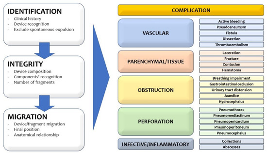 The identification and recognition of a medical device is the first step. Patient clinical history should be examined thoroughly to achieve this goal. Detailed information about implant or utilization time and modality, and device brand, shape, material, and expected location should be provided by clinicians and the patient himself. All these factors are useful in choosing the most appropriate imaging modality for device identification and recognition, improving the radiologist’s diagnostic accuracy, and reducing time between diagnosis and treatment (Figure 1).