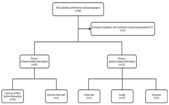 Approval was obtained from the institutional review board and informed consent was waived for this study. In a review of data at our university hospital between January 2010 and November 2019, there were 66 patients with PDA who underwent both routine chest CT and echocardiography. Two patients were excluded from this study due to insufficient enhancement (n = 2). Thus, a total of 64 patients with PDA (51 and 13 patients from the two institutions, respectively) comprised the study. The enrolled patients were subcategorized as group 1 (pretest information present) or group 2 (pretest information absent) based on whether pretest information regarding the diagnosis of PDA was available (Figure 1). Diagnosis of PDA was confirmed with echocardiography in all the enrolled patients.