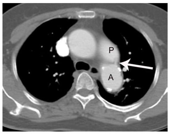 A case of PDA in a 56 -year-old female patient (group 2) missed on both the initial CT report and by the two blind readers. On axial post-contrast images with 3 mm slice-thickness at the level of tracheal carina, a small linear enhancing structure (arrow) connecting the left main pulmonary artery (P) and aortic isthmus (A) is subtly noted, but was missed on the initial CT reading.